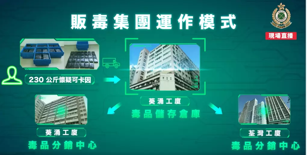 調查期間,海關發現販毒集團的成員將貨物運送及儲存在葵涌工廈單位內,在之後兩個星期的時間,都沒再工廈單位出現。相反販毒集團成員,在這兩星期期間,到訪葵涌及荃灣其它工廈單位,過程中並沒有運送任何貨物。