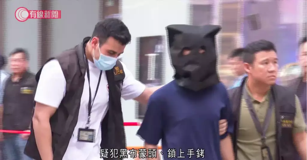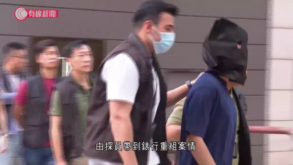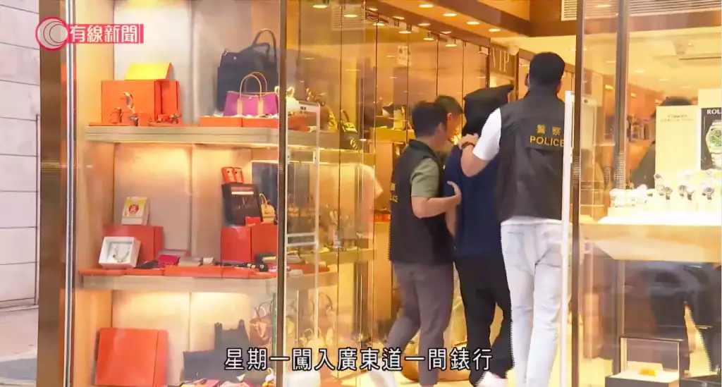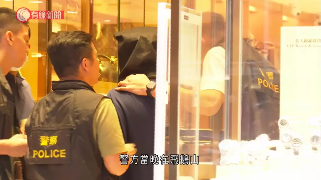 疑犯被黑布蒙頭,在幾名探員押解下,進入錶行,期間探員向疑犯查問,在現場逗留約10分鐘後離開,西九龍總區刑事部警司鍾雅倫亦有到場。