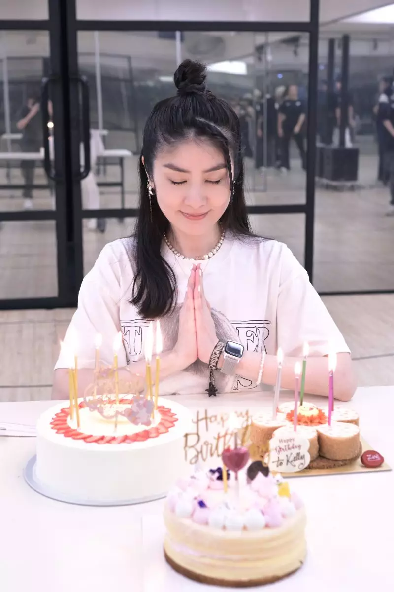Kelly說:「疫情下好耐冇試過一班人過生日,今日好開心!可以同一班舞台戰友齊齊砌蛋糕,兩個囝囝就等我今晚排完舞再同我屋企慶祝,生日願望?梗係身體健康,演唱會順利,歌迷難忘!」