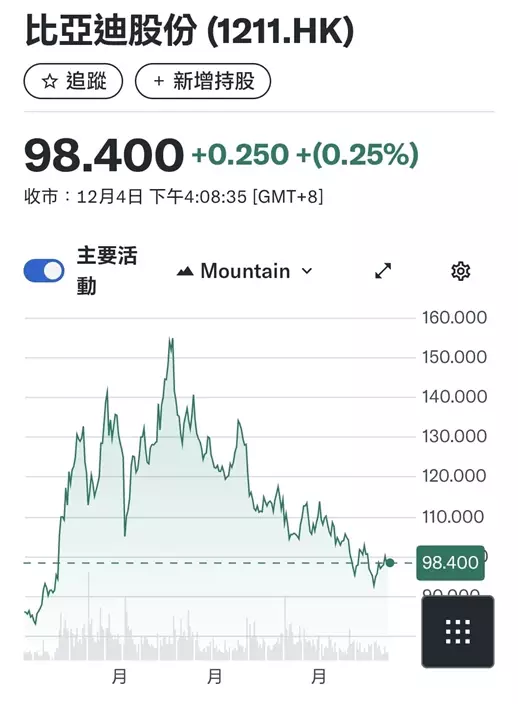 今年內地汽車板塊唔係好掂,出現一個前高後低的走勢,以汽車第一股比亞迪(1211)為例,今年初88元,5月升上159元的高位,周四收98.4元,雖然比年初仍有12%進帳,但在100元(即拆細前300元)以上買入者仍要捱價。汽車股唔掂主要受競爭內捲的氣氛影響,市場睇淡整個板塊,恐怕來年前半段仍會維持這種走勢。