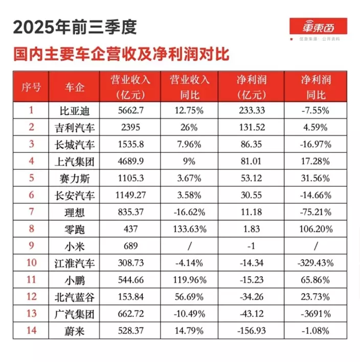 內地公眾號「車東西」總結了內地首3季汽車股業績。截至12月4日,內地已有14家主要車企發佈了今年第3季度財務報告,整合各車企今年前3個季度的業績後發現:這14家國內車企今年前3季度營收規模總和達到2.1萬億元人民幣,純利總和為364億元,簡單計算一下,這14家車企淨利率僅為1.8%,利潤率偏低,可見內地車市競爭何等激烈。