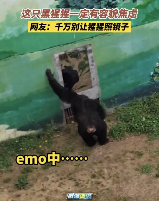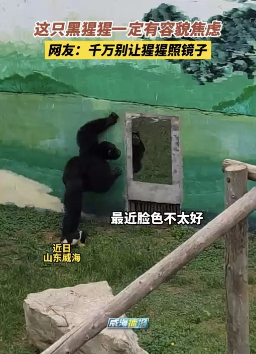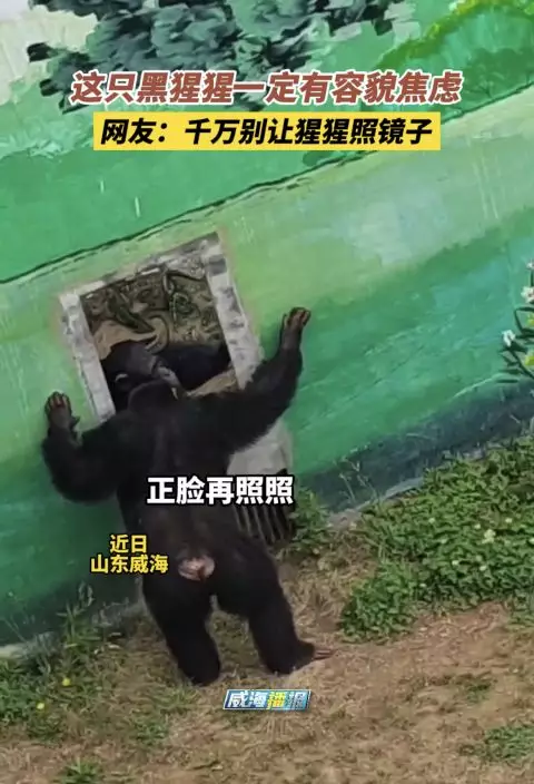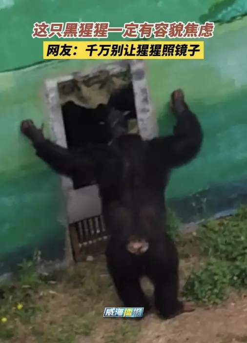 日前,山東威海神雕山野生動物世界一隻黑猩猩照鏡子的逗趣影片在網上瘋傳,不少網友爆笑不已。黑猩猩名為「東東」,一開始牠似乎對鏡子有些好奇且陌生,於是有些謹慎地站在一旁細看鏡子,隨後牠兩手扶著墻,仔細端詳著鏡中的自己。