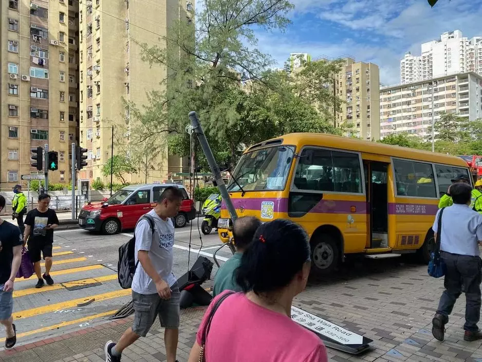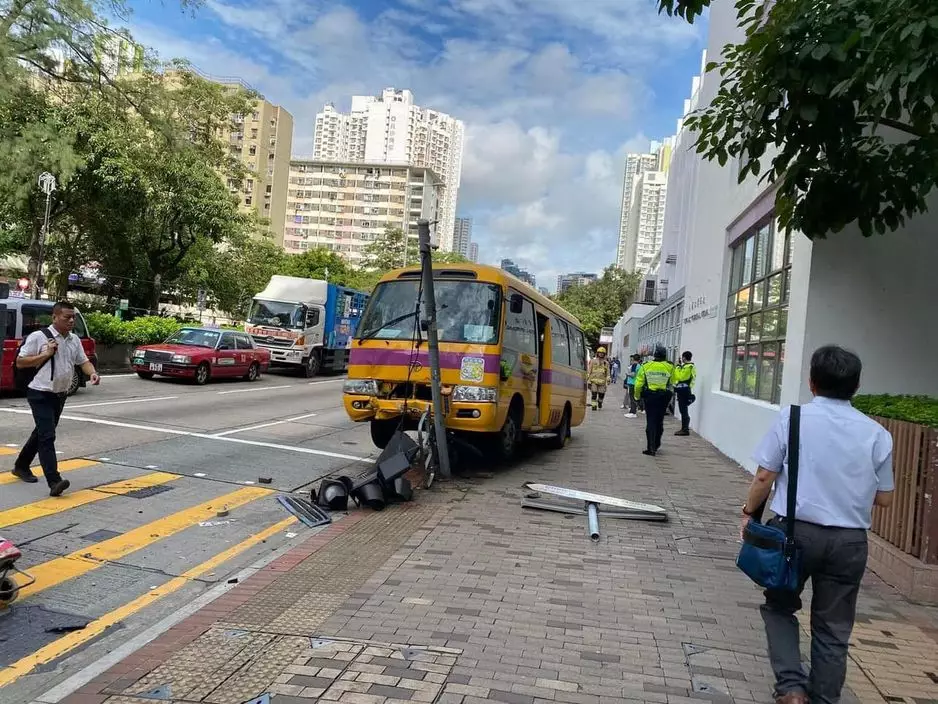 15日早上8時許,一輛校巴沿長沙灣道向旺角方向行駛,駛至九龍工業學校對開燈位時,突然失控撞向路邊交通燈及路牌,幸好車上5位名學童及保姆均無受傷,司機亦僅受輕傷。校巴車頭損毀嚴重,而路邊的交通燈及路牌就被撞毁。