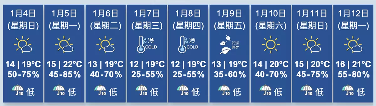 展望未來兩三日早上市區最低氣溫在12、13度左右,新界再低幾度,天晴及非常乾燥,日夜溫差頗大。