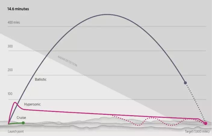 巡航導彈(綠色)和彈道導彈(藍色)以及高超音速武器(粉色)的近似速度和軌跡對比,高超音速導彈被拉升到空中,然後高速滑翔到其打擊目標處。圖自《華爾街日報》