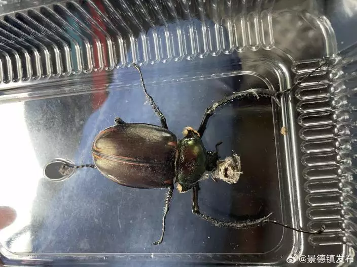 浮梁縣公安局森林分局近日接到民眾報警稱,在湘湖鎮的一位居民家中出現了一隻巨大的甲蟲。隨後民警前往現場,發現這隻甲蟲呈墨綠色,甲殼閃耀金屬般的光澤,前肢修長,看起來像是一種叫做「陽彩臂金龜」的甲蟲。為了確保甲蟲的安全,民警將其帶回分局並進行照料。