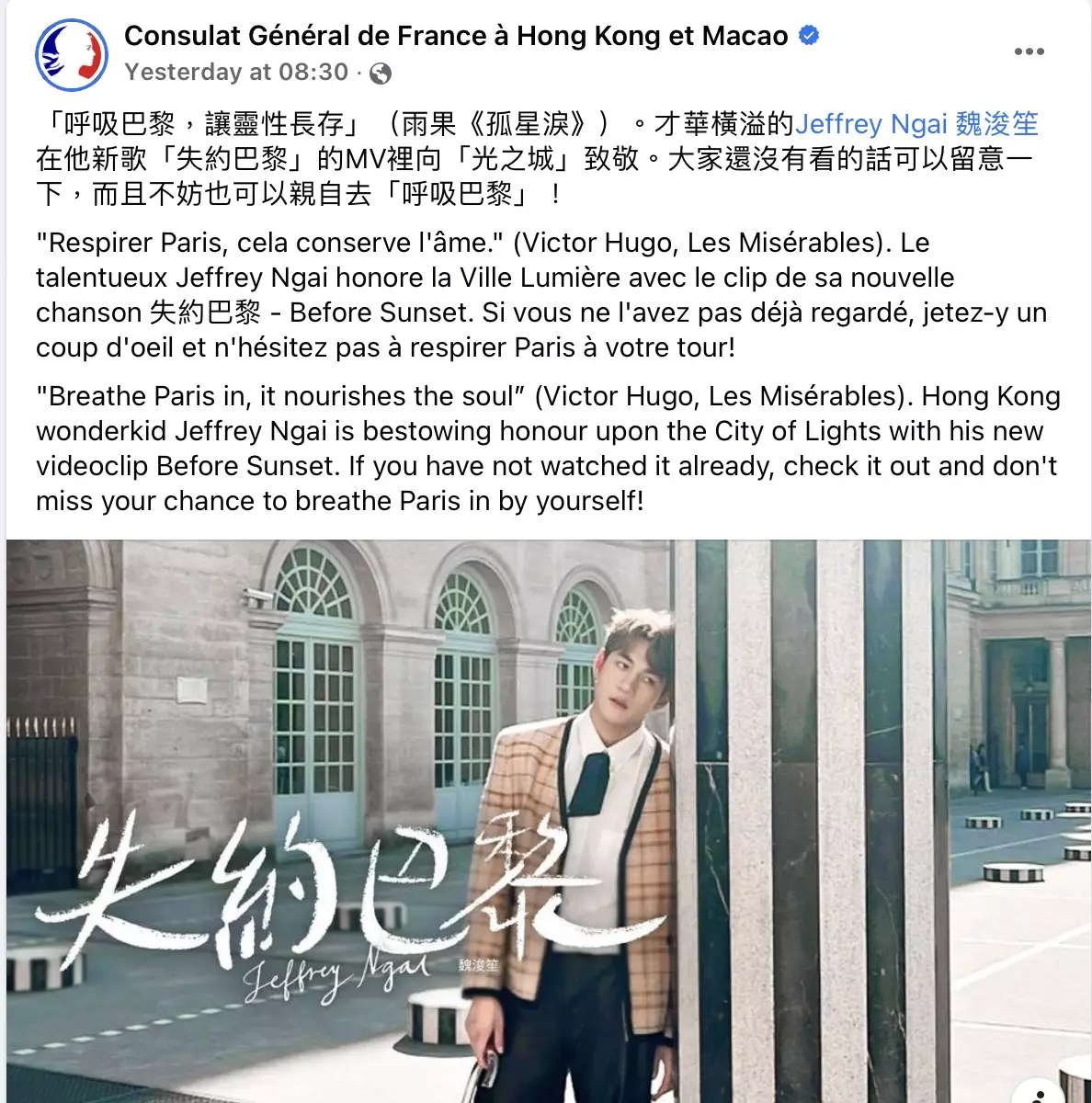 Jeffrey見到法國駐香港及澳門總領事館專頁推介《失約巴黎》MV,表示超級驚喜。