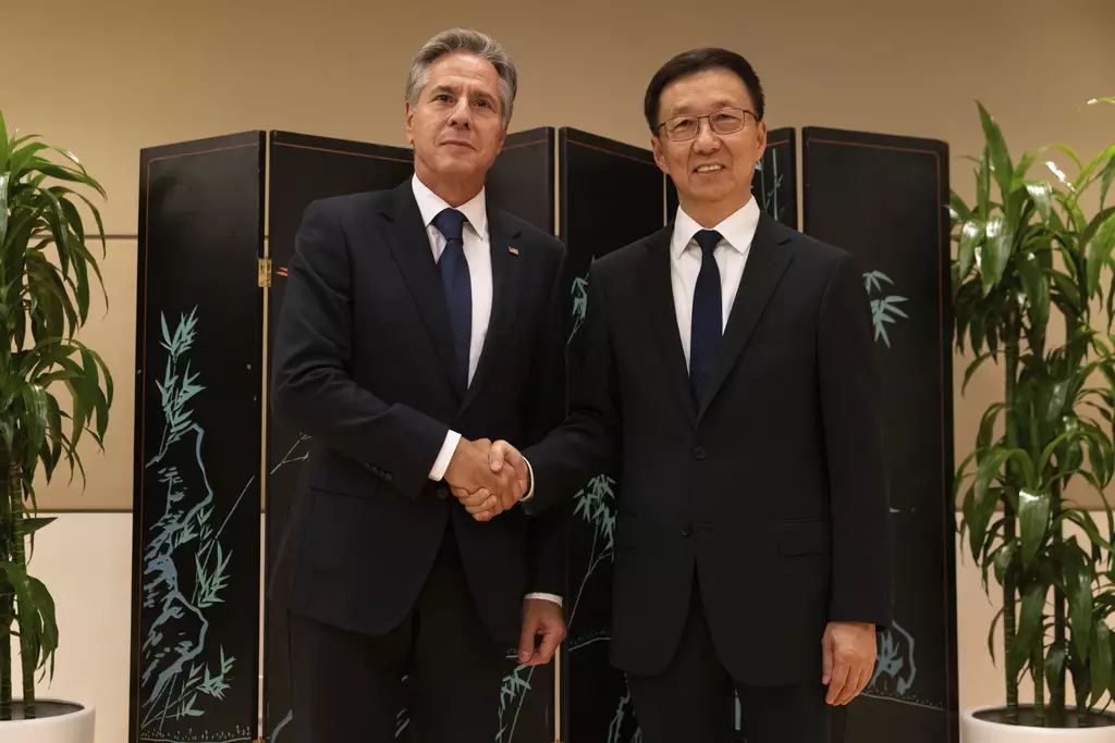 正在紐約出席聯合國大會的國家副主席韓正,與美國國務卿布林肯舉行會談。