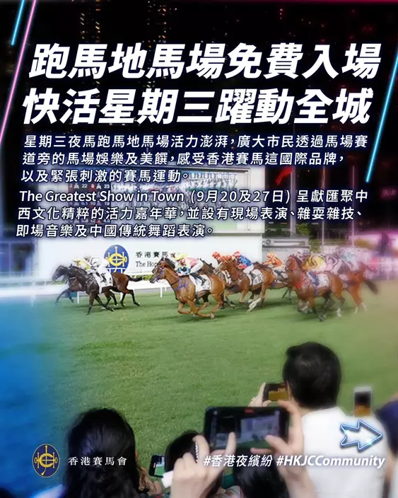 馬會表示,由9月20日起至12月,市民逢星期三晚可免費進入跑馬地馬場公眾席享受「快活星期三」。除了「啤酒園」外,市民和遊客還可以在馬場賽道旁,欣賞一系列主題表演以及享受美味佳餚。