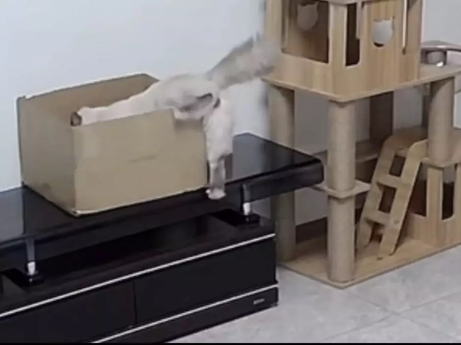 布偶貓首次跳凳子失手慘摔,試圖躲進紙箱掩飾尷尬卻再次陷困,令飼主和狗狗也驚呆。