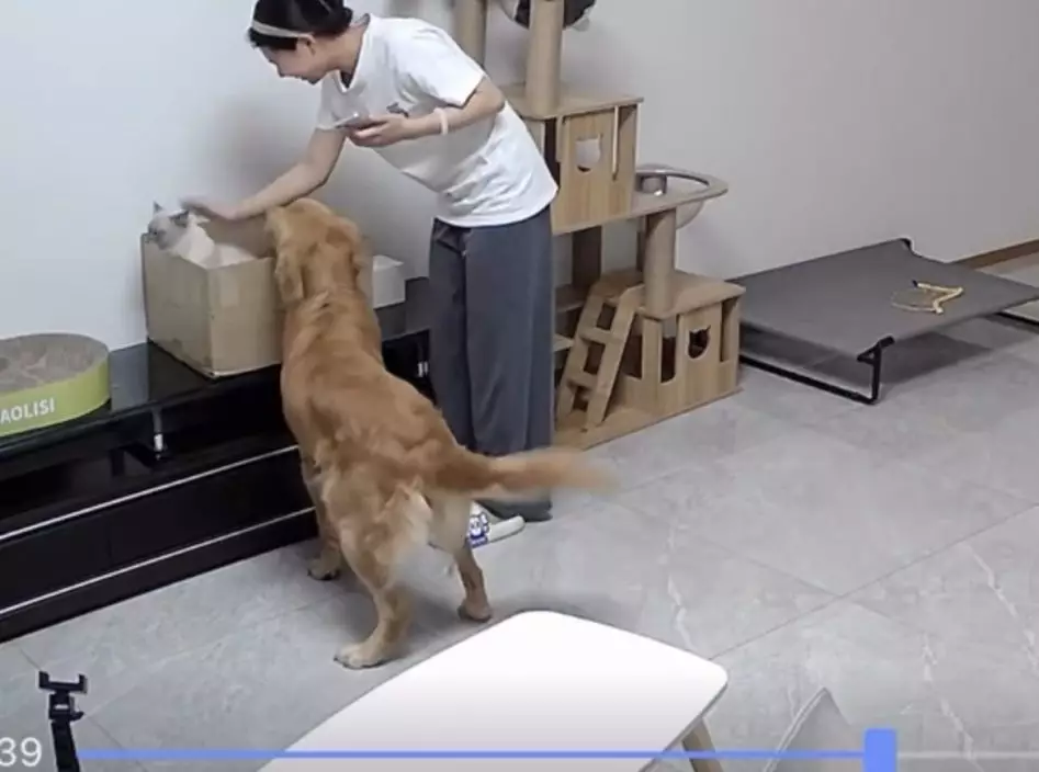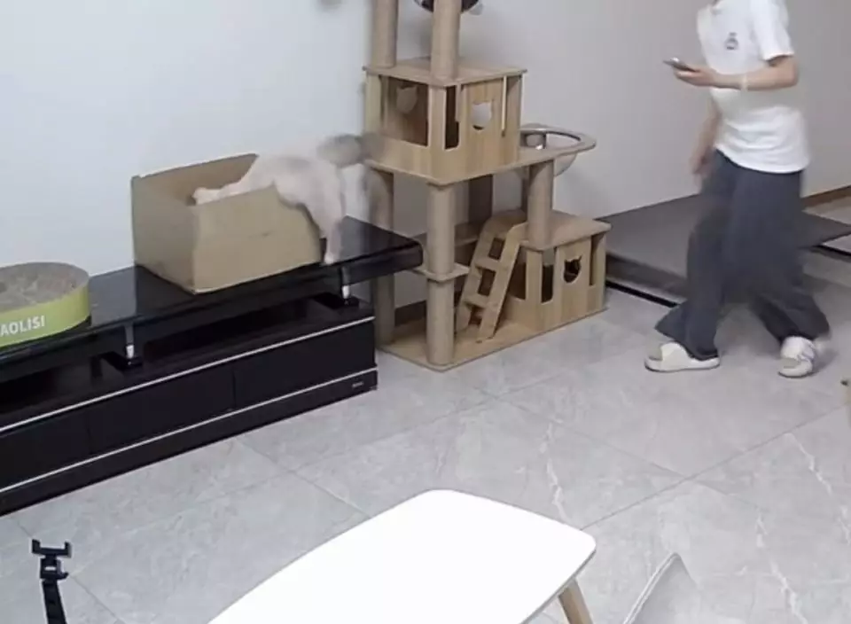 然而,愛貓並沒有理會飼主,只見牠走向另外一邊,打算跳進櫃子上的紙箱躲一會,怎料卻再次跳躍失敗,下半身直接掛在紙箱邊緣,模樣相當狼狽,一旁的狗狗「葫蘆」見狀也忍不住湊上前圍觀,這一幕讓飼主爆笑不已!