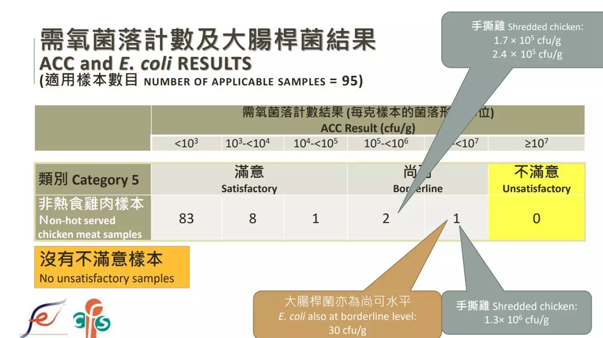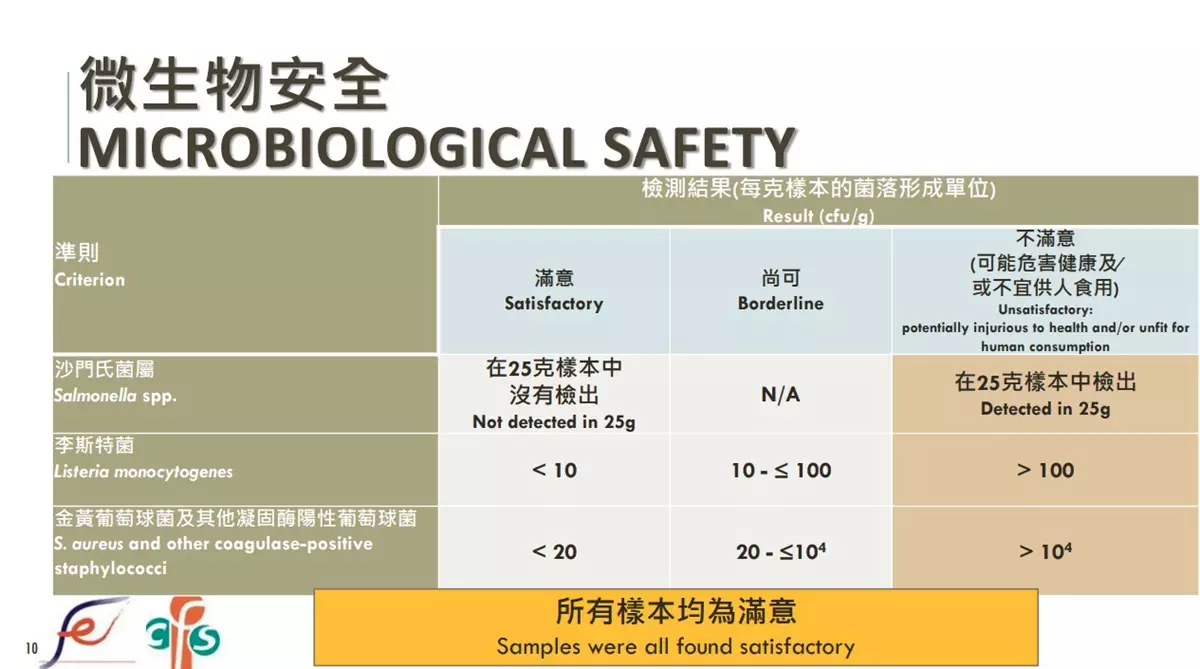 在總菌數方面,有3個樣本的水平只是屬於尚可,其中一個手撕雞樣本的總菌數相對高一些,但未至於不滿意水平;微生物安全指標方面,全部樣本均滿意,找不到致病菌。