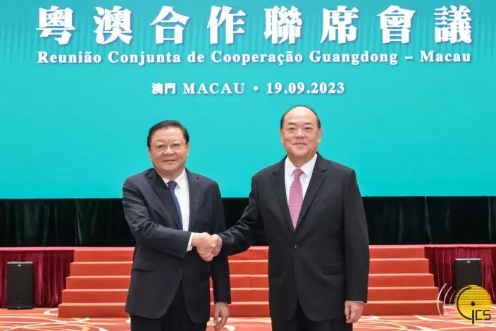 2023年粵澳合作聯席會議今(19)日在中國與葡語國家商貿合作服務平台綜合體舉行,行政長官賀一誠和廣東省省長王偉中分別率領兩地政府代表團出席會議。雙方總結過去一年,粵澳兩地高層互訪更頻密,各領域交流更深入,合作關係更密切,進一步豐富粵澳合作的內涵和意義。未來,粵澳將進一步務實深化兩地各領域合作,深入推進橫琴粵澳深度合作區建設、粵港澳大灣區建設凝心聚力、共謀發展。