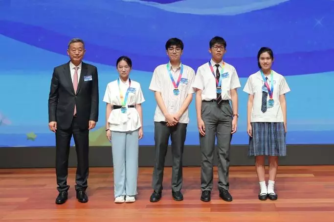 華潤集團董事長王祥明向中學組金獎學生張涵月、陳以心、鍾至烺、林姗慧頒發獎牌。