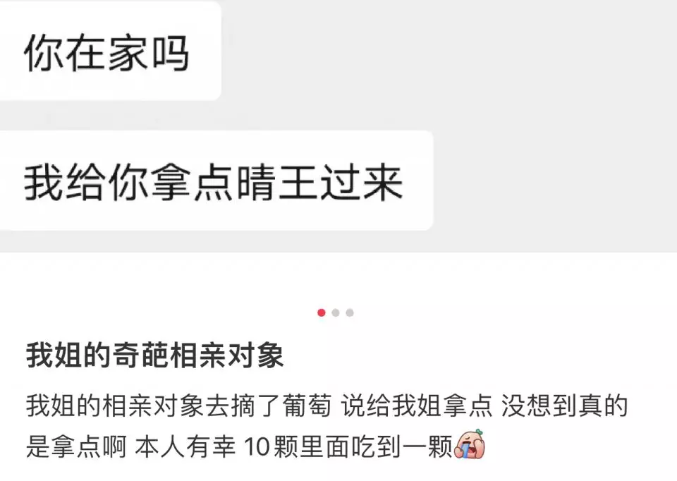 帖主進一步提到,姐姐的相親對象不僅發成果照,還很貼心的詢問姐姐是否在家,想要拿點「晴王」葡萄送到家裡,帖主得知後原以為對方頗為體貼,未料到實際送來的「禮物」卻讓人哭笑不得。只見一個透明塑膠袋裝著幾顆葡萄就送了過來,令帖主忍不住公開吐槽,「本人有幸,10顆裡面吃到一顆」。