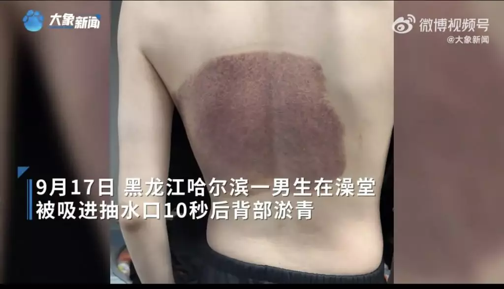 內地男學生在澡堂泡澡意外被抽水口吸附,短短10秒後背部留下大片瘀青猶如拔罐般!