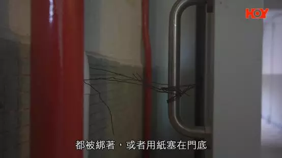 《一線搜查》到現場視察,發覺貴瑤樓有不少樓層已經安裝防煙門,但有幾道防煙門卻被綁著或者用紙塞在門底。(《一線搜查》影片截圖)