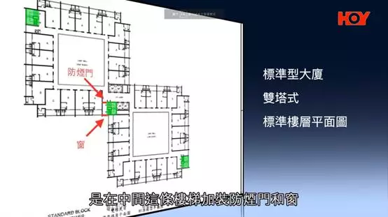 井字型公屋是雙塔式設計,現於中間樓梯位置加裝防煙門及窗,似乎截斷了兩邊的對流風。(《一線搜查》影片截圖)