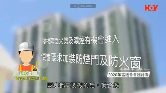 而屋宇署屋宇測量師郭志慶表示,樓梯兩面火勢及濃煙有機會進入,若經評估後有需要做,便會要求加裝防煙門及防火窗。(《一線搜查》影片截圖)
