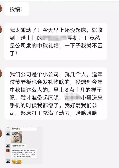 內地一名打工仔在微博用戶「領導我是小明」發文投稿,他表示日前早上正準備起床時,突然收到快遞送來的iPhone手機,收到手機那一刻他一臉茫然,隨後得知是公司為所有員工準備的中秋節禮物時,他感到十分驚喜:「一下子我就不睏了」。