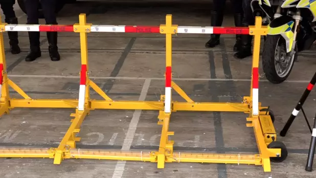 警方引入一款內地「可攜式遙控移動阻車器」,在路障使用,即日起在三個總區試行。