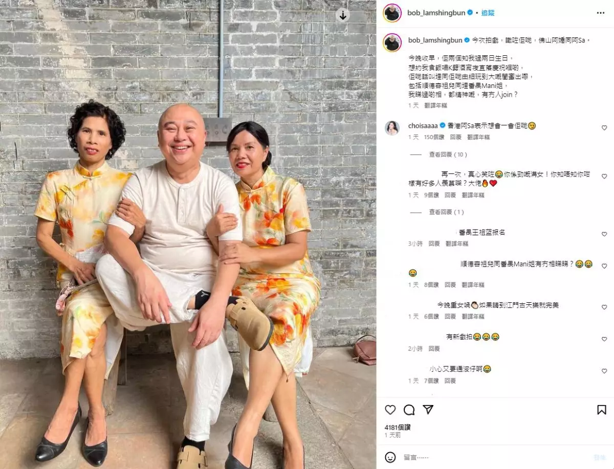 林盛斌分享合照並留言:「今次拍戲,識咗佢哋,佛山阿嬌同阿Sa。今晚收早,佢兩個知我過兩日生日,想約我食飯唱K劈酒宵夜直落慶祝嗰啲,佢哋話叫埋同佢哋由細玩到大嘅閨蜜出嚟,包括順德容祖兒同埋番禺Mani姐,我睇過啲相,都精神嘅,有冇人join?」合照中的林盛斌一身白色,而穿著旗袍的佛山Twins一左一右攬住他的手臂,認真有趣!