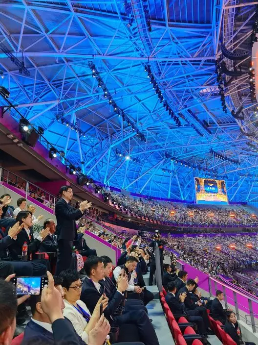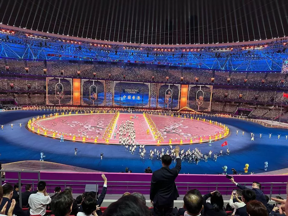 李家超在港隊代表團進場時,站立拍手致意。他說,香港運動員為備戰亞運竭盡全力,衷心祝願每名運動員能夠在比賽場上發揮最佳表現,同時享受每一場比賽。他又鼓勵市民多關注亞運會的比賽資訊和動向,一同為國家隊和香港隊打氣。