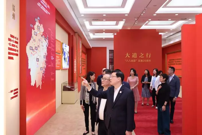 李家超中午參加由國家主席習近平為來華出席亞運會開幕式的國際貴賓設的歡迎宴會,之後到浙江展覽館參觀「八八戰略」實施20周年主題展覽,了解習近平在2003年擔任浙江省委書記時,就浙江省未來發展提出進一步發揮八個方面的優勢、推進八個方面舉措的「八八戰略」系統方案,指引浙江走出改革創新開放圖強之路。