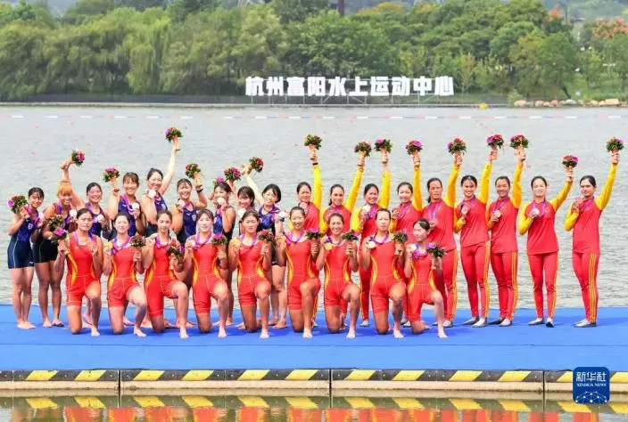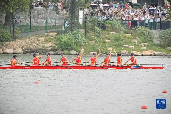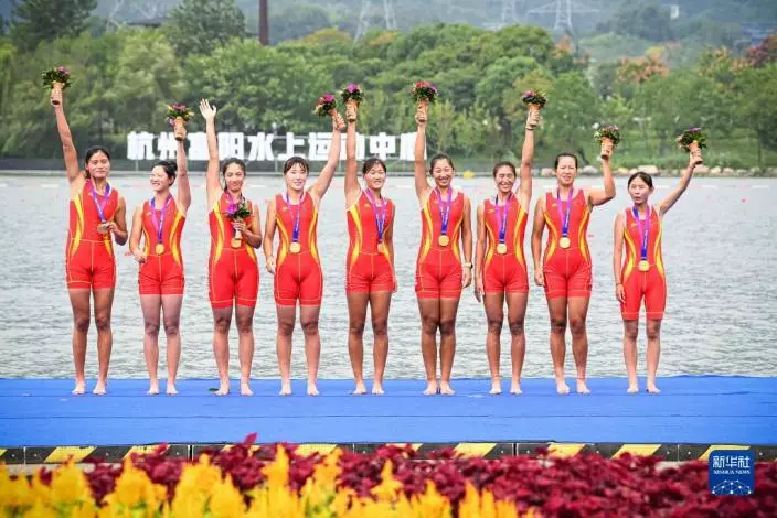 杭州亞運賽艇女子八人單槳有舵手決賽,國家隊奪得金牌。這是中國體育代表團在亞運會上收穫的第1500枚金牌。
