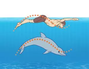 如果曾學習蝶式, 蝶腰/蝶腳(dolphin kick)可以針對收緊下腹和下身, 如下圖: