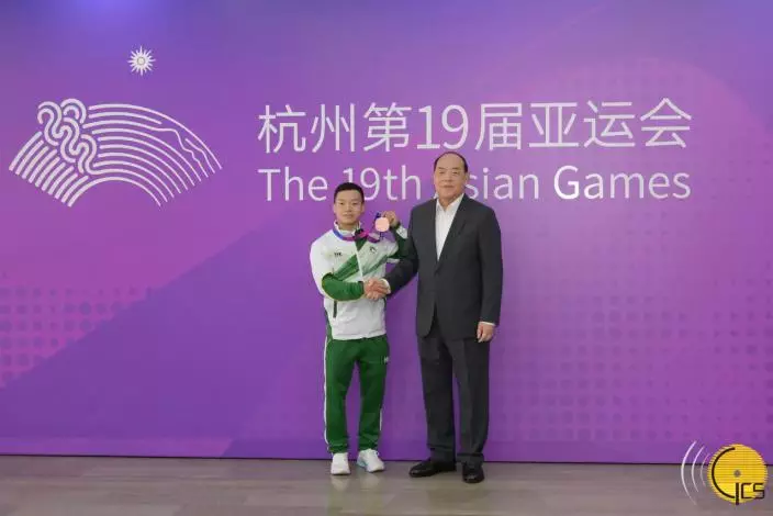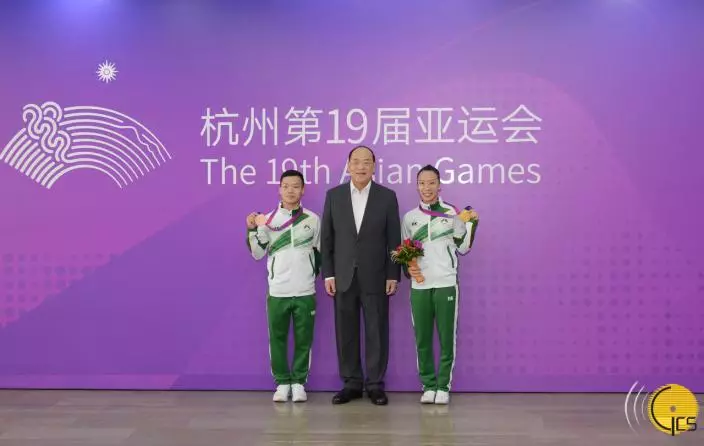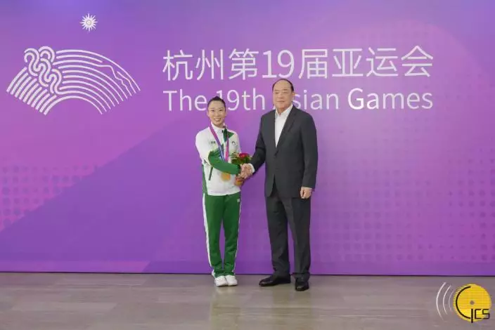 澳門行政長官賀一誠祝賀奪得杭州亞運女子長拳金牌的本澳運動員李禕。澳門新聞局圖片