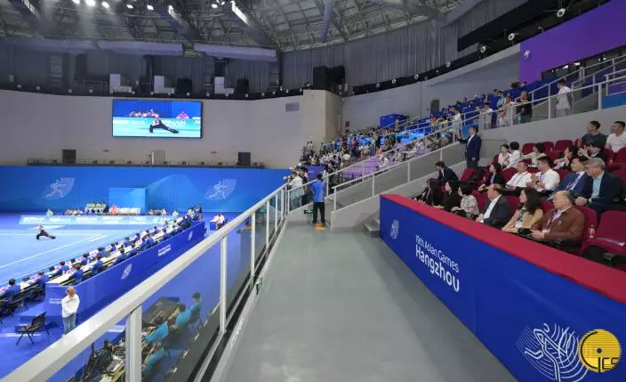 澳門行政長官上午到達杭州的蕭山瓜瀝文化體育中心,觀看有李禕和蘇楚雯兩名澳門選手參與競逐的武術項目—女子長拳決實。澳門運動員上場時,澳門行政長官和澳門觀摩團一起為她們歡呼鼓勁。