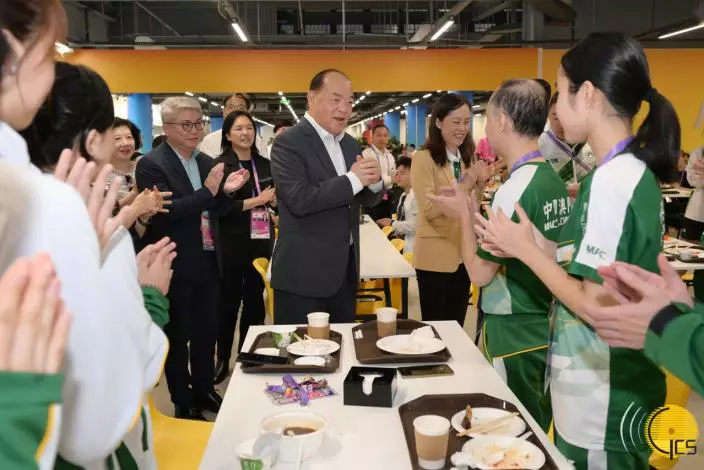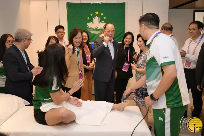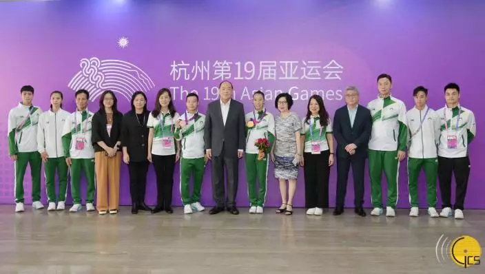 正在杭州的澳門行政長官賀一誠,今(25)日上午到場觀看亞運女子長拳決賽,為參賽的澳門選手加油打氣並見證李禕勇奪金牌。澳門行政長官一行之後到亞運村探望澳門體育代表團成員,勉勵他們再創佳績、享受賽事,與各地運動員加強交流,助力宣揚及推廣澳門。