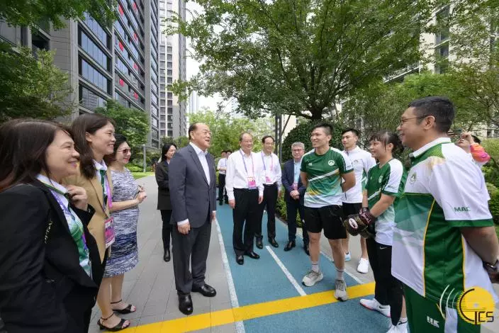 接着,澳門行政長官一行轉往亞運村參觀,探望澳門體育代表團成員,與他們交流,了解其備戰狀態、在杭州期間的起居生活,以及與各地健兒建立友誼和增進交流的情況。澳門行政長官寄語體育代表團要珍惜參與亞運的時光,透過與各地區運動員競技和交流,弘揚中華體育精神,推廣澳門形象。同時要保重身體,以最佳狀態爭取佳績,為國家、為澳門贏得榮譽,也為2025年粵港澳聯合承辦的第十五屆全國運動會做好充份準備;特區政府將持續支持澳門運動員及澳門體育事業的發展。