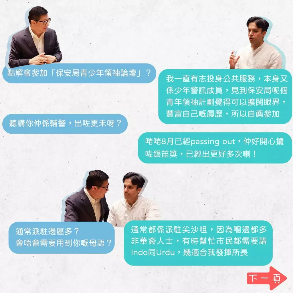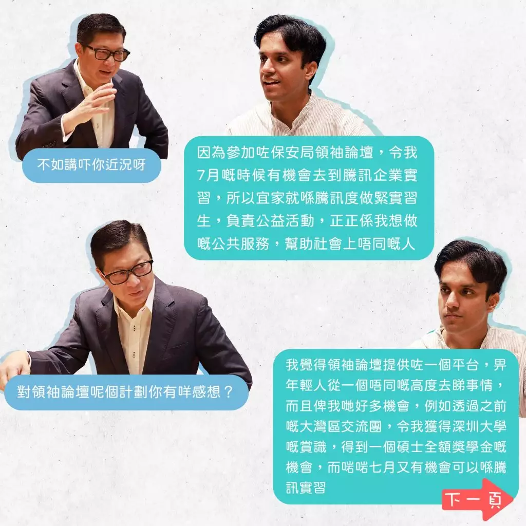 鄧炳強提到,其中一位令他印象深刻的學員,是在香港落地生根的印裔青年Kobe。鄧炳強表示,這位青年待人謙遜,積極上進,還說得一口流利的粵語和普通話,Kobe在過去一年的交流活動當中,更被大型互聯網企業賞識聘用實習,鄧炳強指,得知Kobe對投身公共服務也相當感興趣,他感歎過去一年對青年學員的栽培果然沒有白費。