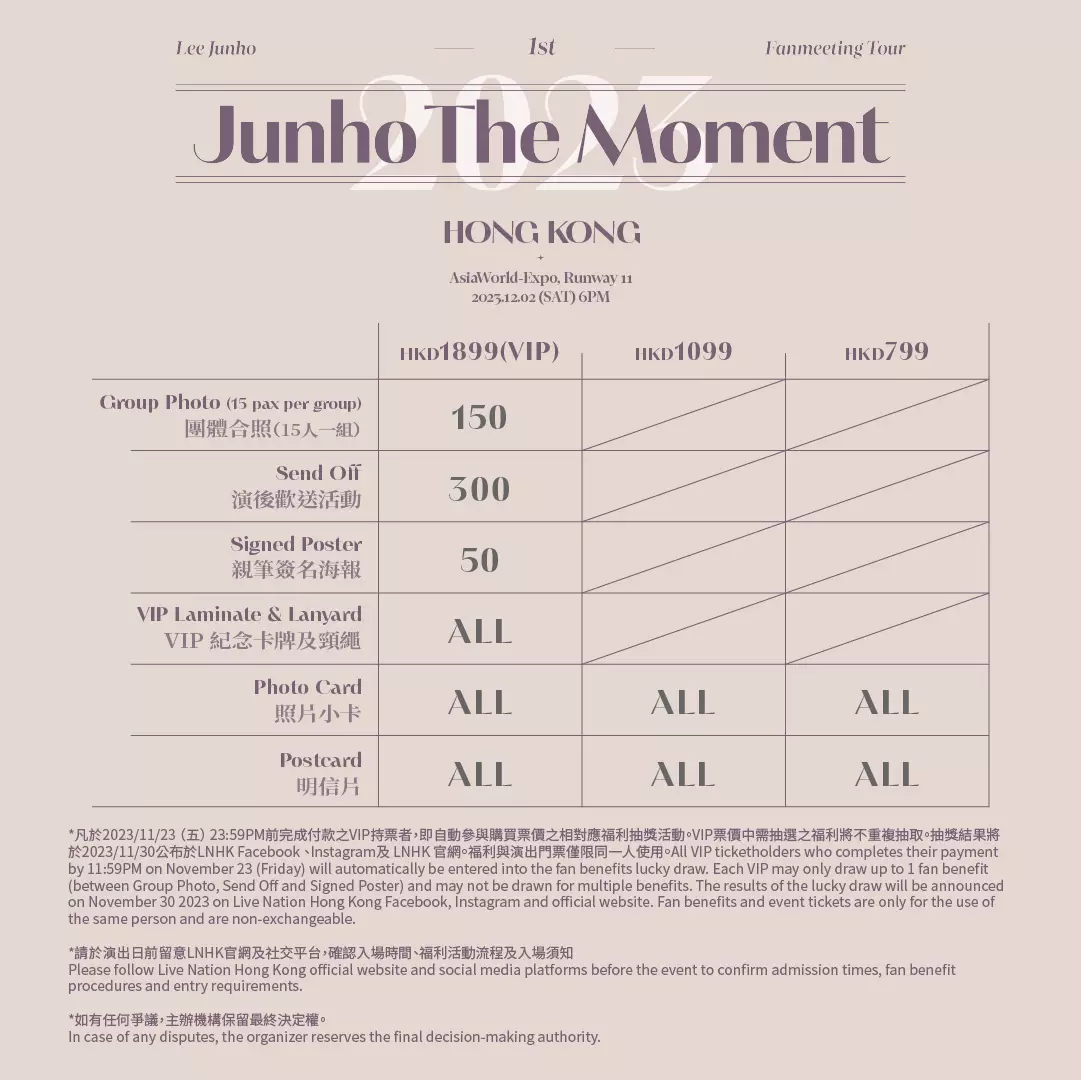 《LEE JUNHO 1st FANMEETING TOUR <JUNHO THE MOMENT 2023> IN HONG KONG》門票由港幣799起,於2023年10月10日(星期二)上午10時起經www.cityline.com網站及購票熱線+852 2111 5333公開發售。Live Nation會員可於2023年10月9日(星期一)上午10時至下午11時59分優先購買門票。如欲成為會員或查詢有關資訊,請瀏覽www.livenation.hk。