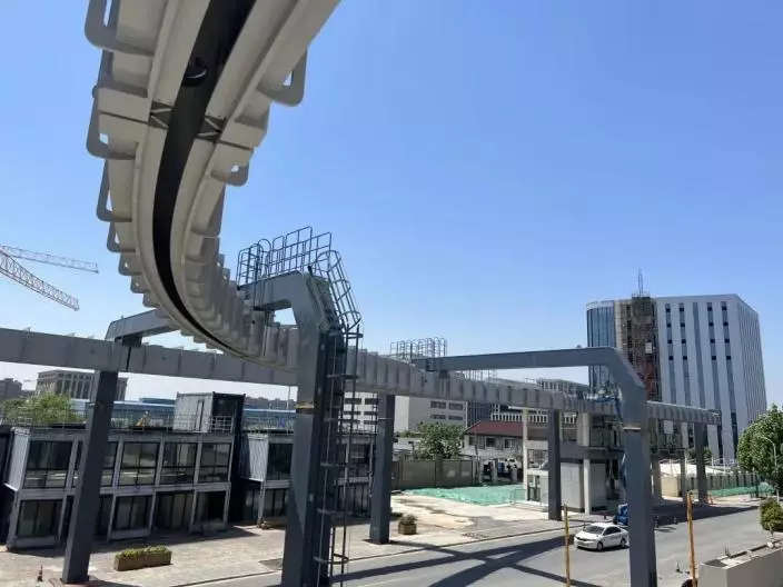 從地面上抬頭觀看,可以發現一條「懸空」架設著的「鋼骨架」軌道,這條軌道由鋼立柱支撐懸掛於空中,一端延伸至空鐵示範線項目的首座車站,另一端則接入維保車間。據了解,吊掛式的空鐵列車將以30公里的平均時速在線路與站點間穿梭,至於兩層樓高的車站則是用來列車停靠和上下客。