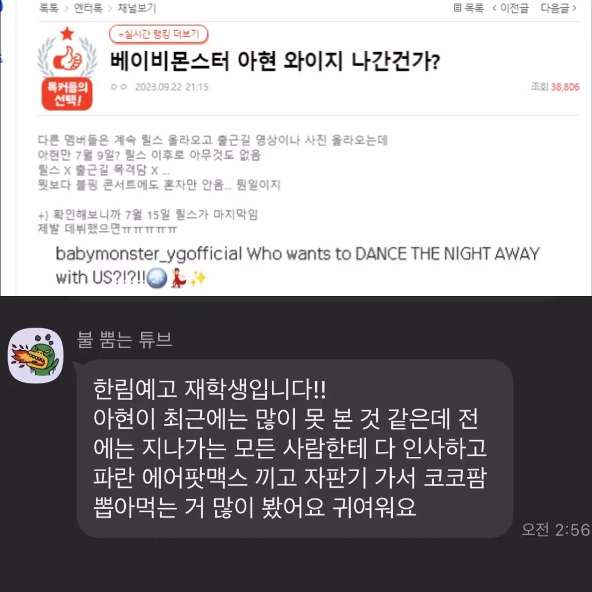 網上又出現了自稱與Ahyeon就讀同一間學校翰林高中的網友,該網友發文寫道:「最近沒怎麼看見Ahyeon,以前常常路過時會打招呼,戴著藍色的AirPods Max去自動販賣機買吃的。」看來Ahyeon既沒有去YG公司練習也沒有去學校,因此讓粉絲更加擔憂,「退團傳聞」也正在持續散播中。