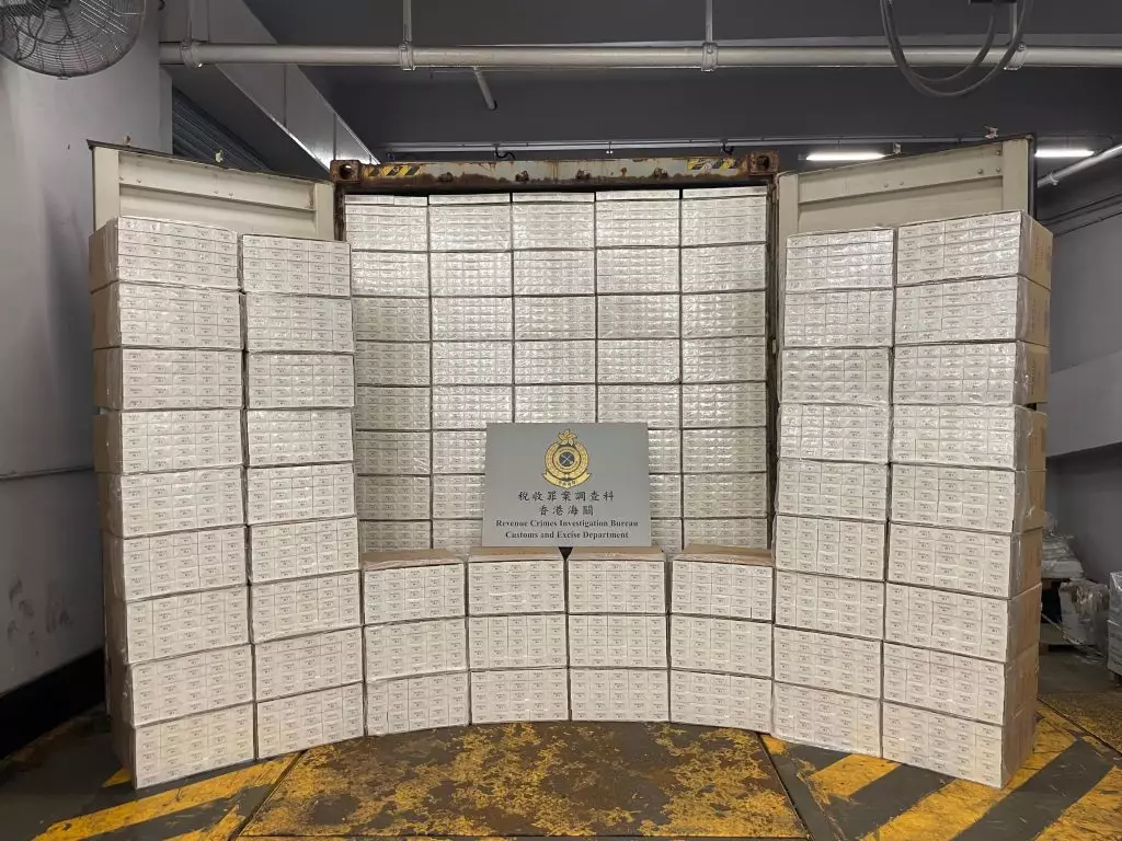 而在今個星期一,海關人員查驗一個從南韓抵港,報稱載有汽車零件的40呎海運貨櫃,檢獲約1100萬支懷疑私煙。