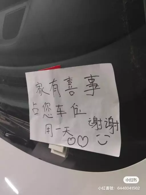 日前,內地一名車主發文分享了車位被人擅自「佔用」的經歷,他表示當天自己正準備停車時,發現自己的車位已被他人佔據,他立即怒火中燒想要大發雷霆時,卻看到佔用車位的車上貼有一張紙條,上面寫著「家有喜事,佔您車位用一天,謝謝」,但他卻感到奇怪,認為自己沒有必須要包容的必要。
