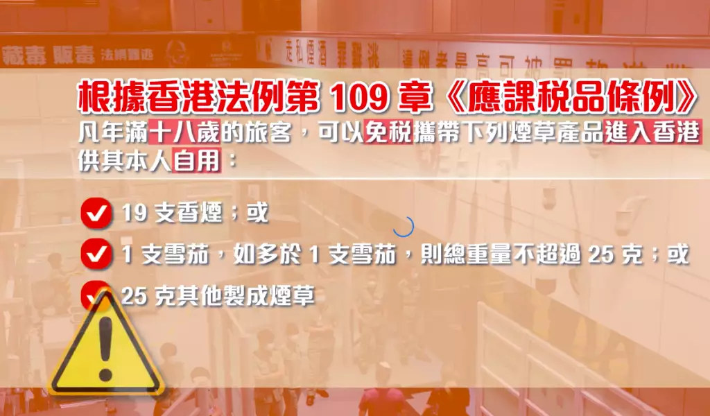 海關提醒市民,入境香港時要留意每一名年滿 18 歲的旅客可以免稅攜帶進入香港的煙草產品有限。