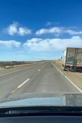 影片中可見,當時他正常處於一望無際的公路上,突然前方的大卡車停了下來並將車停到了路肩,原來他還打算繼續加速前行,沒想到前車司機在下車後示意他停車避讓,原來,路中間有一隻小海獅因來往車輛導致驚慌失措。