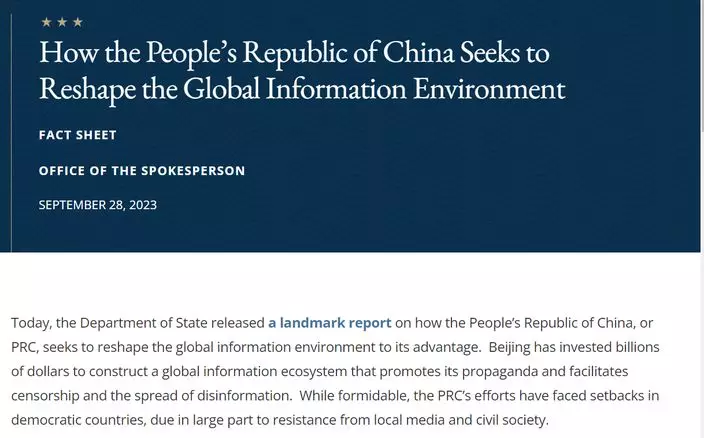 美國國務院發表報告,指中國每年花費數十億美元,用於操縱境外資訊,方法包括利用宣傳、虛假資訊和內容審查,同時推廣有關中國和中國共產黨的正面新聞。報告警告,如果不加以控制,全球資訊格局將被重塑,並威脅世界各地的言論自由。