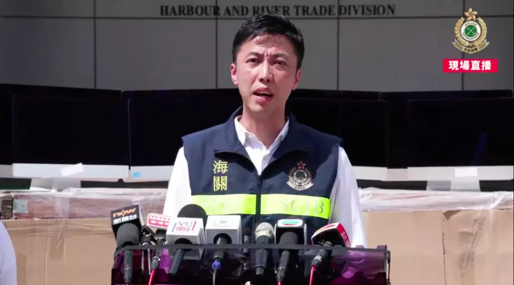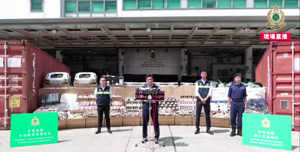 海關特別調查第二組指揮官張文傑表示,8月21日,海關鎖定一艘到報稱載運膠粒準備運往上海的貨櫃,在葵涌貨櫃碼頭利用X光掃描系統檢查,發現影像有異,打開後發現內藏7噸懷疑受管制的瀕危魚翅、3噸凍肉、50萬件電子產品和2000枝餐酒,總值約6400萬港幣。