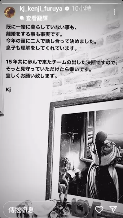 偷食新聞曝光後,降谷立即在限時動態承認婚變,並留言:「今年年初,我們兩個人商量並決定(分開),我兒子也理解。這決定是由我們這個合作了15年的團隊共同做出的,如果您能繼續關注我們,我們將不勝感激,謝謝!」