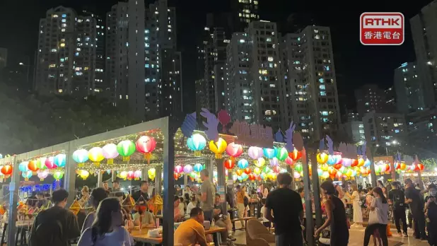 入夜後,不少市民與家人外出慶祝中秋,其中位於堅尼地城卑路乍灣海濱長廊的中秋夜市,人頭湧湧,現場設有熟食、乾貨,以及遊戲攤檔,同場亦有樂隊表演,不少市民帶同燈籠到場,感受熱鬧氣氛。
