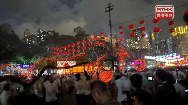 大坑舞火龍今晚舉行,延伸至維園兩個足球場表演,進行簪花掛紅儀式,現場有大批市民觀賞。