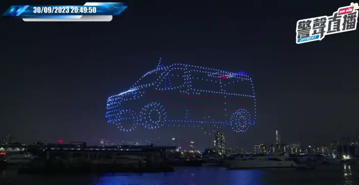 800架無人機創意地在啟德夜空拼出關於「提防騙子」主題的多幅圖案