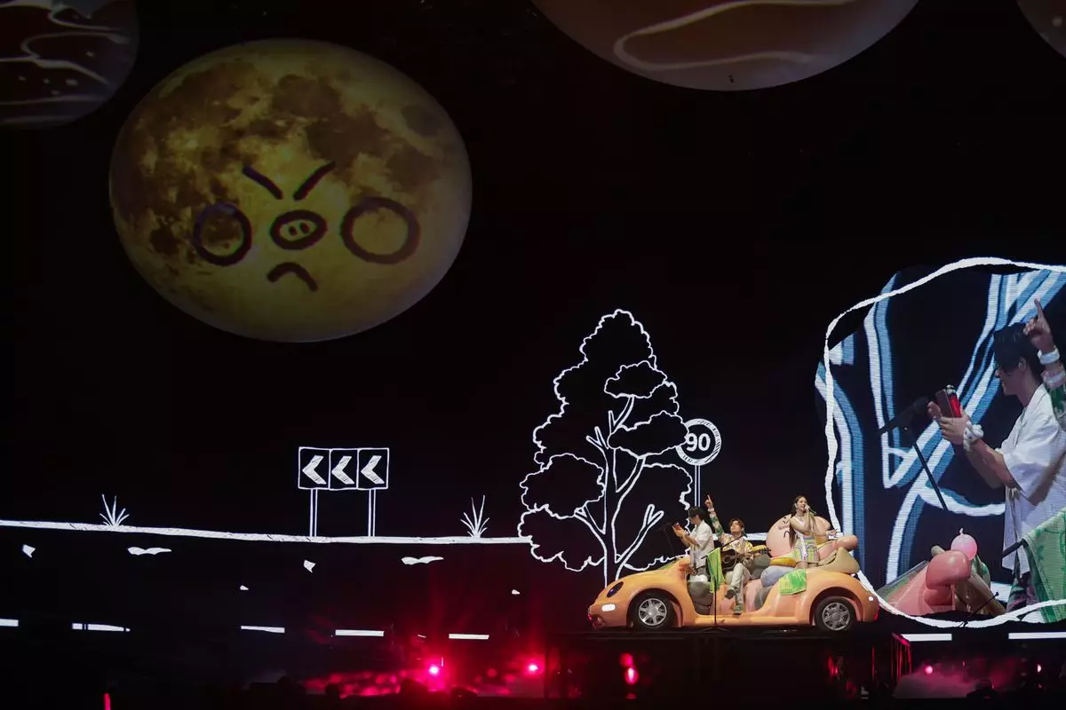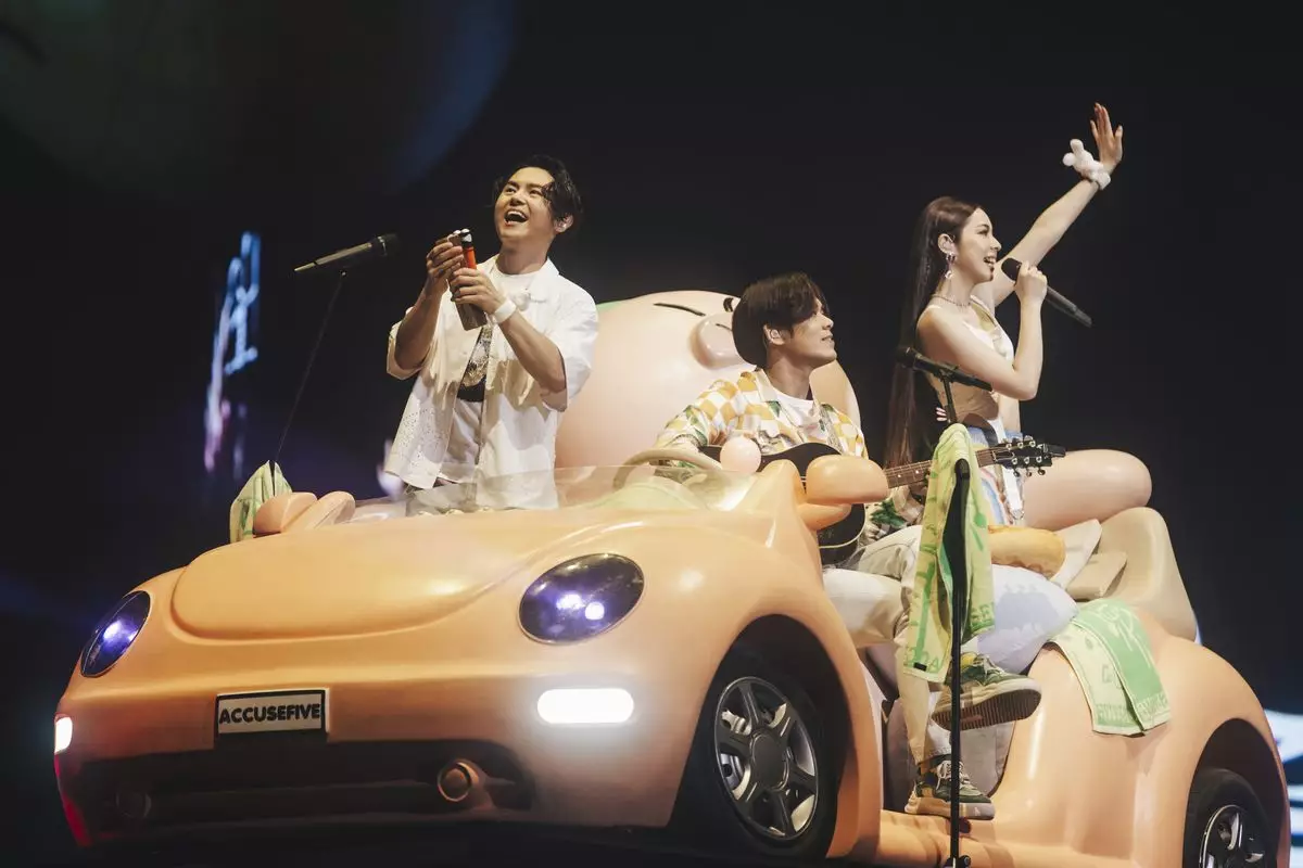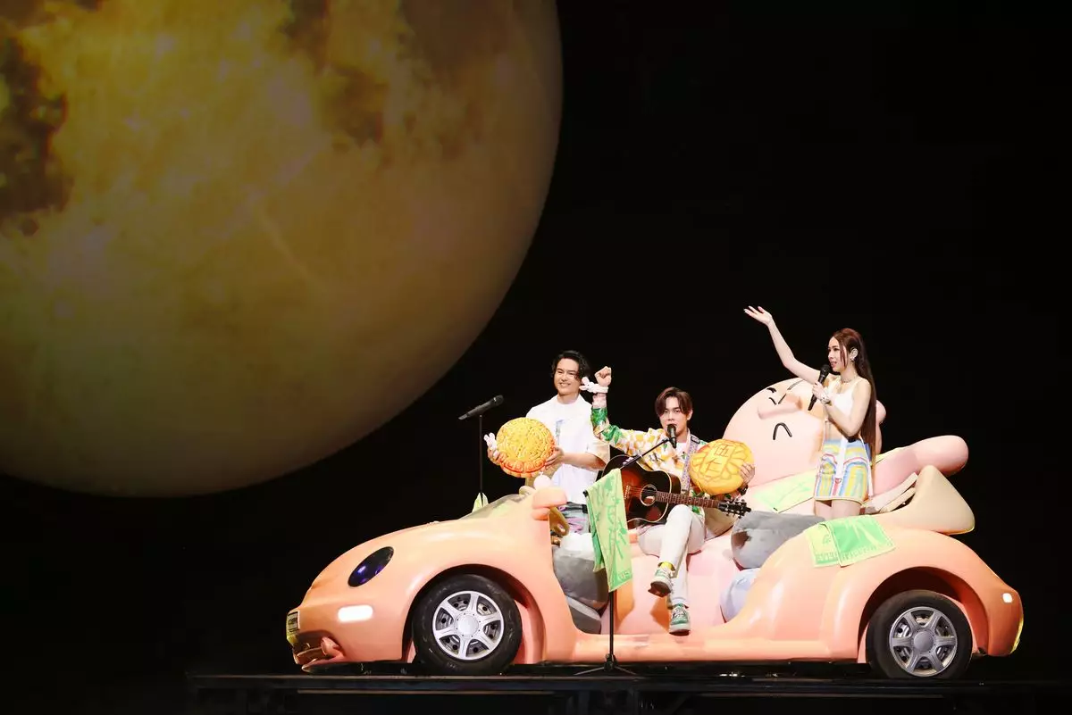 告五人搭著「告五出豬車」緩緩登場演唱《溫蒂公主的侍衛》。(相信音樂提供)