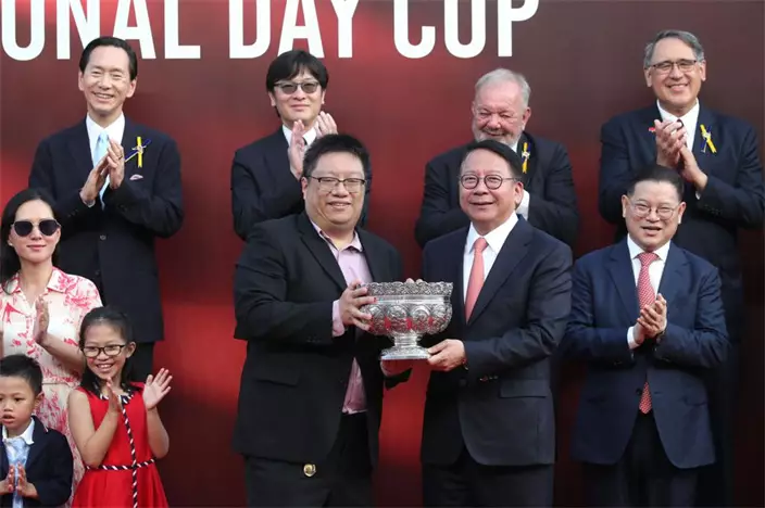 政務司司長陳國基,將國慶盃的獎盃頒發予勝出馬匹「勝不驕」的馬主馬博文。
